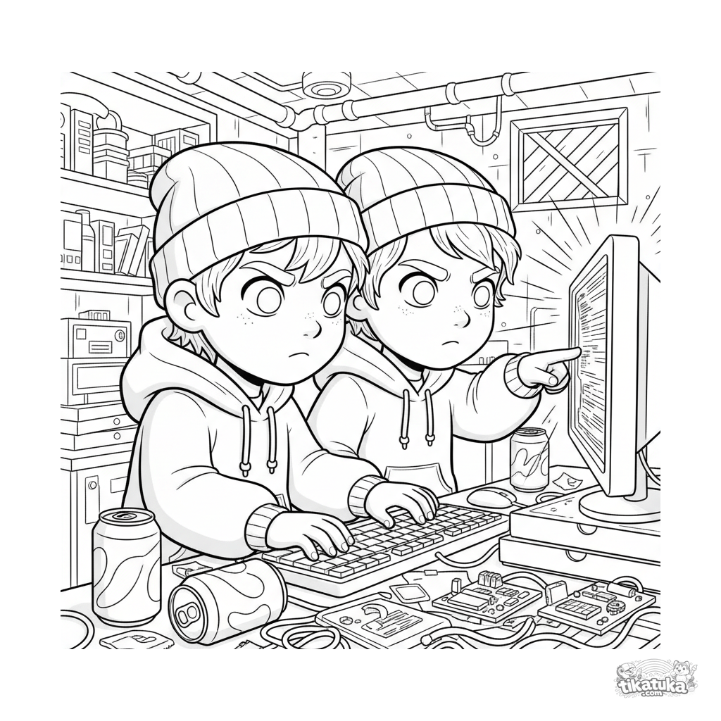 Ausmalbild für Kinder von 10-12 Jahren: Ein Hacker-Duo arbeitet an einem Terminal im Keller. Detaillierte Szene mit Kabeln, Bildschirmen und Dosen.