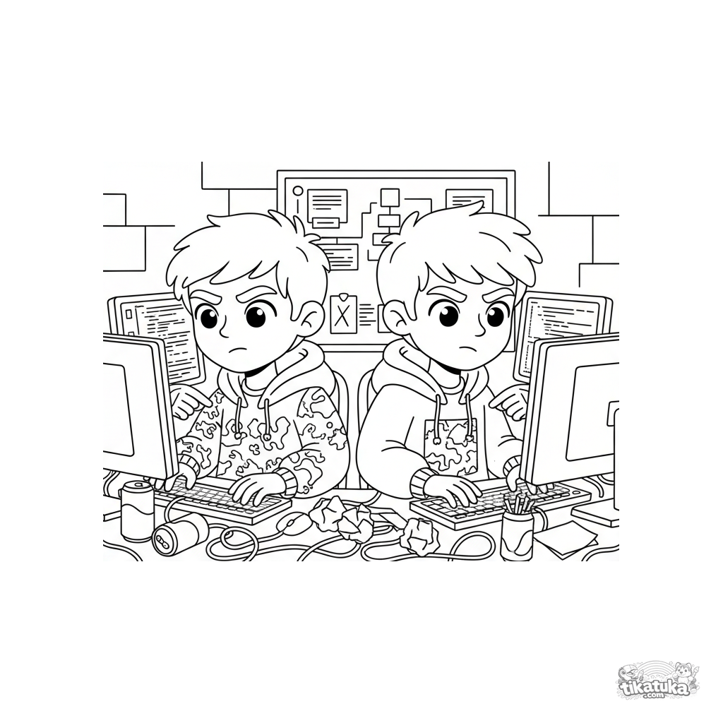 Ausmalbild für Kinder 10-12: Ein Hacker-Duo arbeitet in einem kellerraum voller Monitore. Detaillierte Szene zum kreativen Ausmalen.