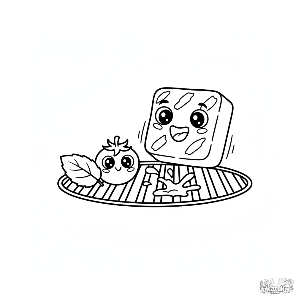 Lustiges Ausmalbild für Kleinkinder 2-3: eine Scheibe Halloumi-Käse springt auf einem Grill. Sehr einfache, kräftige Umrisse, eine große Figur.