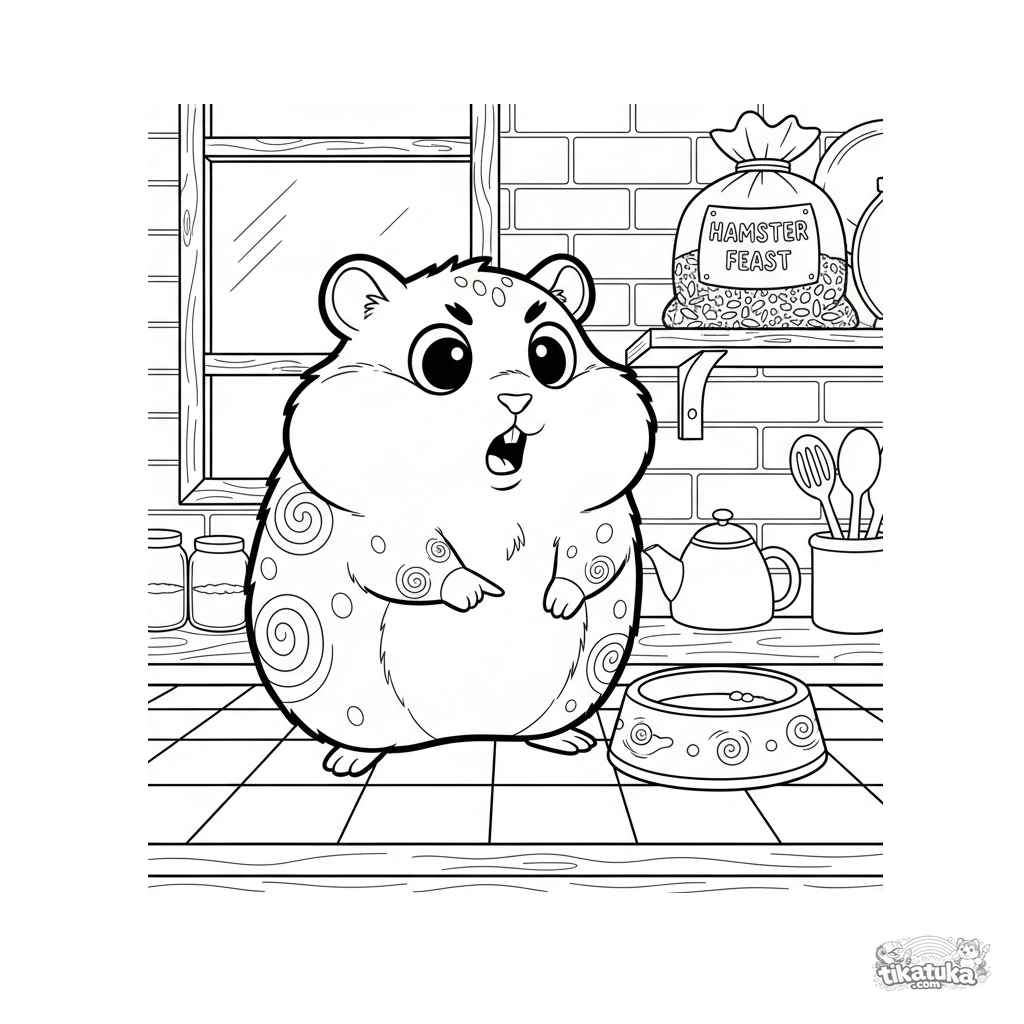Ausmalbild für Kinder von 7 bis 12 Jahren: Ein Hamster mit dramatischem Blick zeigt auf seine leere Futterschüssel auf einer Küchentheke. Nachvollziehbare und lustige Szene.