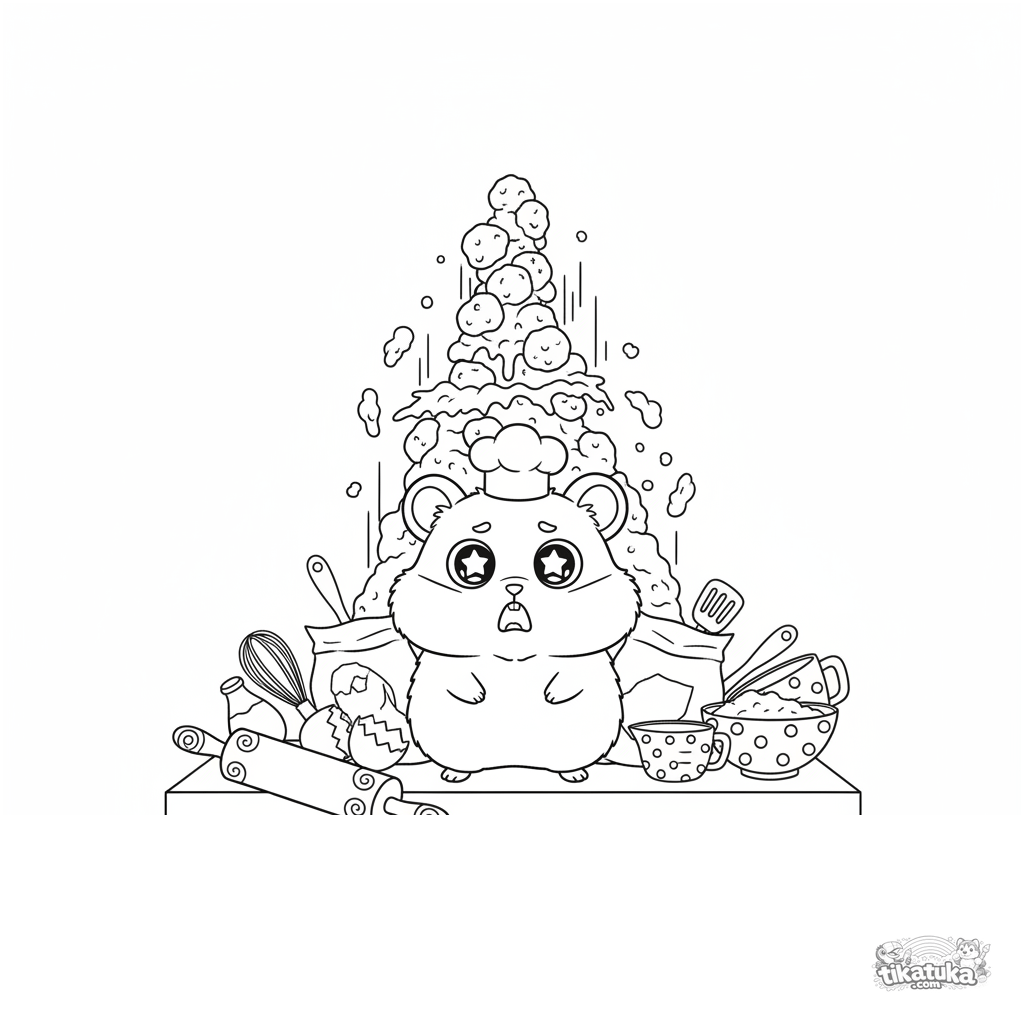 Ausmalbild für Kinder 7-12: Ein Hamster mit Kochmütze sieht schockiert aus, als sein Berg Plätzchenteig zusammenbricht. Chaotische und lustige Epischer-Misserfolg-Szene.