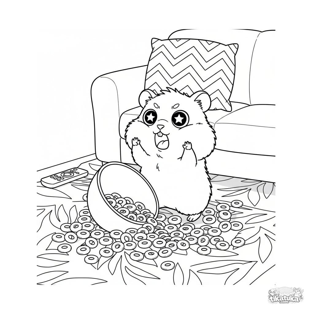 Ausmalbild für Kinder: ein Hamster im Wohnzimmer überreagiert auf verschüttetes Müsli. Detaillierte lustige Szene im Anime-Stil, voller Internet-Humor.