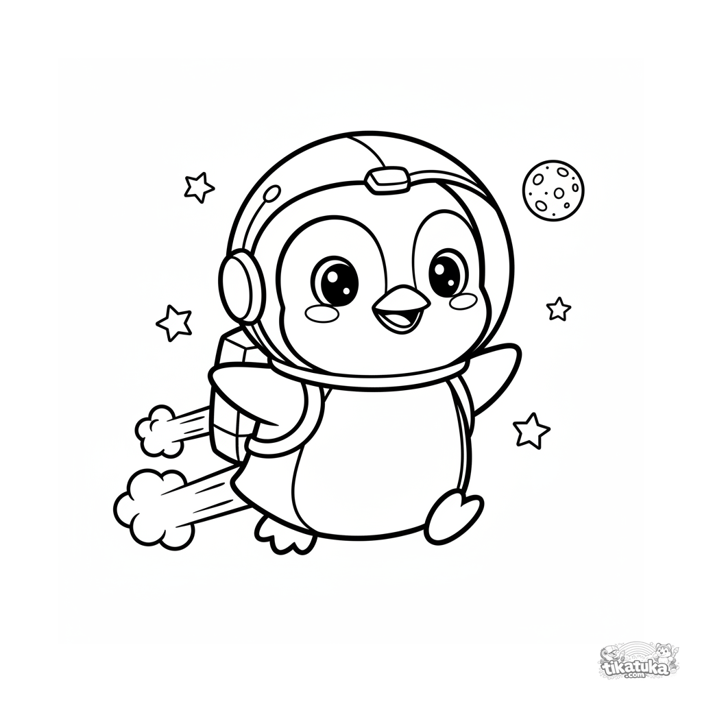 Ausmalbild für Kinder 4-6: Ein fröhlicher Pinguin mit Helm saust mit einem Jetpack zwischen Sternen. Niedlicher Chibi-Stil.