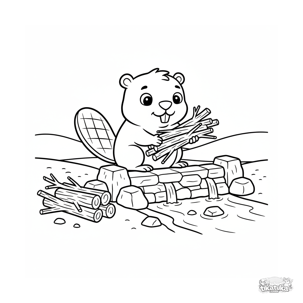 Sehr einfaches Ausmalbild für Kleinkinder 2-3 im Holzspielzeug-Stil: Ein lächelnder Biber baut einen Damm aus Stöcken an einem Bachufer.