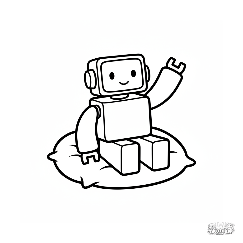 Einfaches Ausmalbild für 2-3 Jahre: ein freundlicher Blockroboter winkt sitzend auf einem Kissen. Große geometrische Formen, minimale Details.