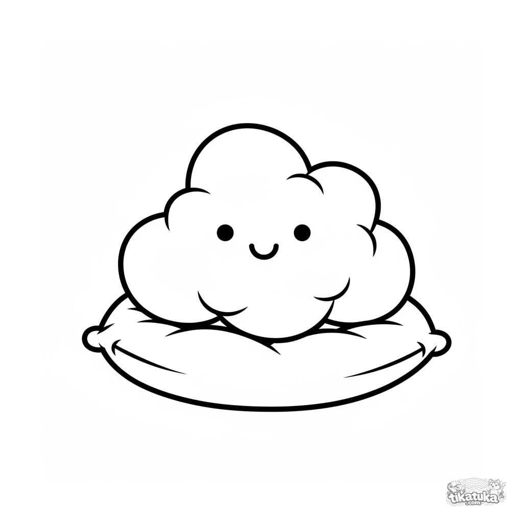Ausmalbild für die Allerkleinsten: eine lächelnde, flauschige kleine Wolke ruht auf einem weichen Kissen. Riesige einfache Formen, minimale Details.