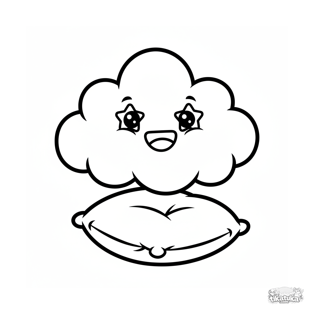 Fröhliches Ausmalbild für 2-3 Jahre: eine lächelnde Wolke schwebt über einem weichen Kissen. Sehr einfache, wellige Formen, große Flächen für Farbe.