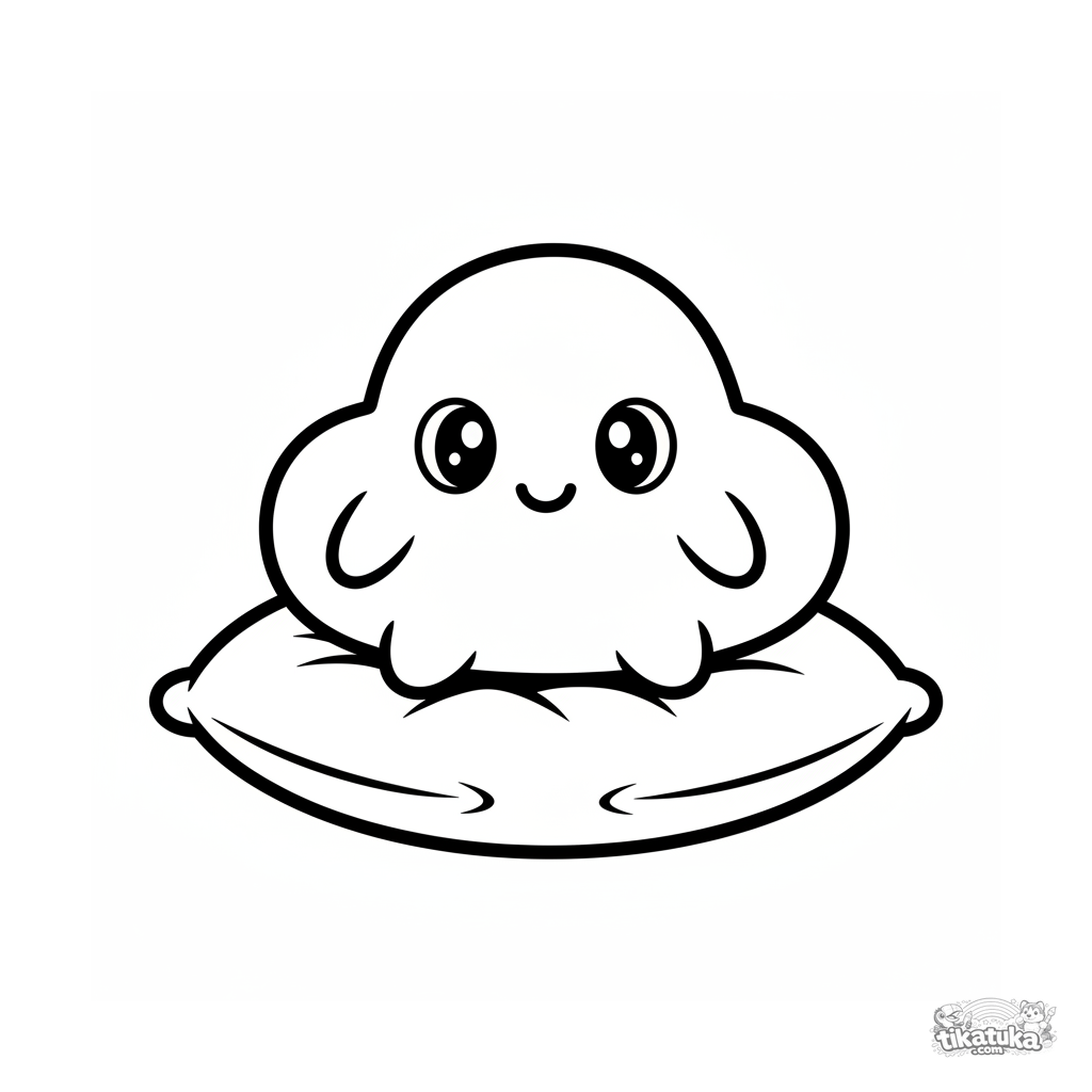 Ausmalbild für die Allerkleinsten: eine lächelnde Wolken-Plüsch ruht auf einem flauschigen Kissen. Sehr einfache, große Formen.