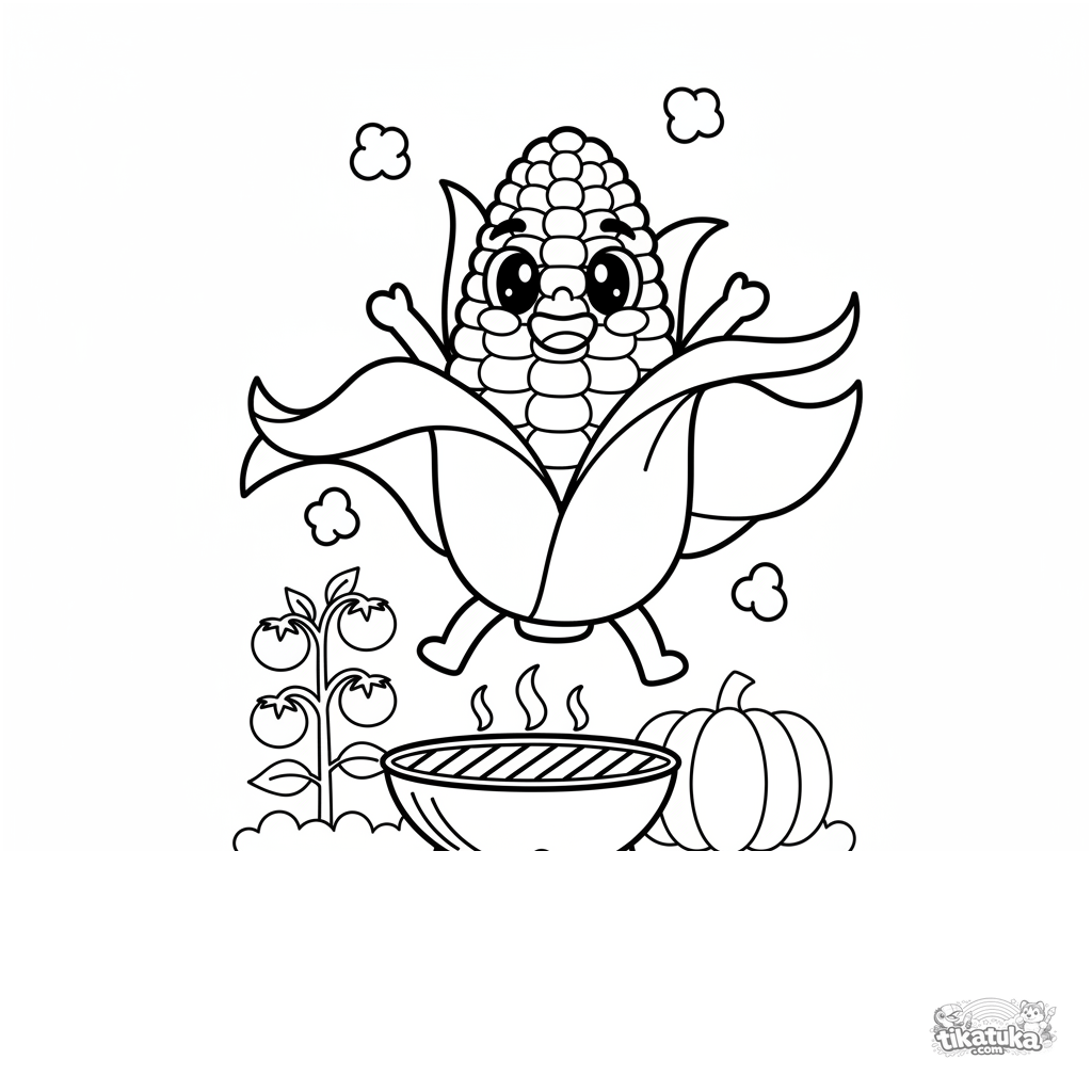 Ausmalbild für Kinder 7-9: ein fröhlicher Maiskolben springt von einem Gartengrill. Drucke und male diese dynamische Szene aus.