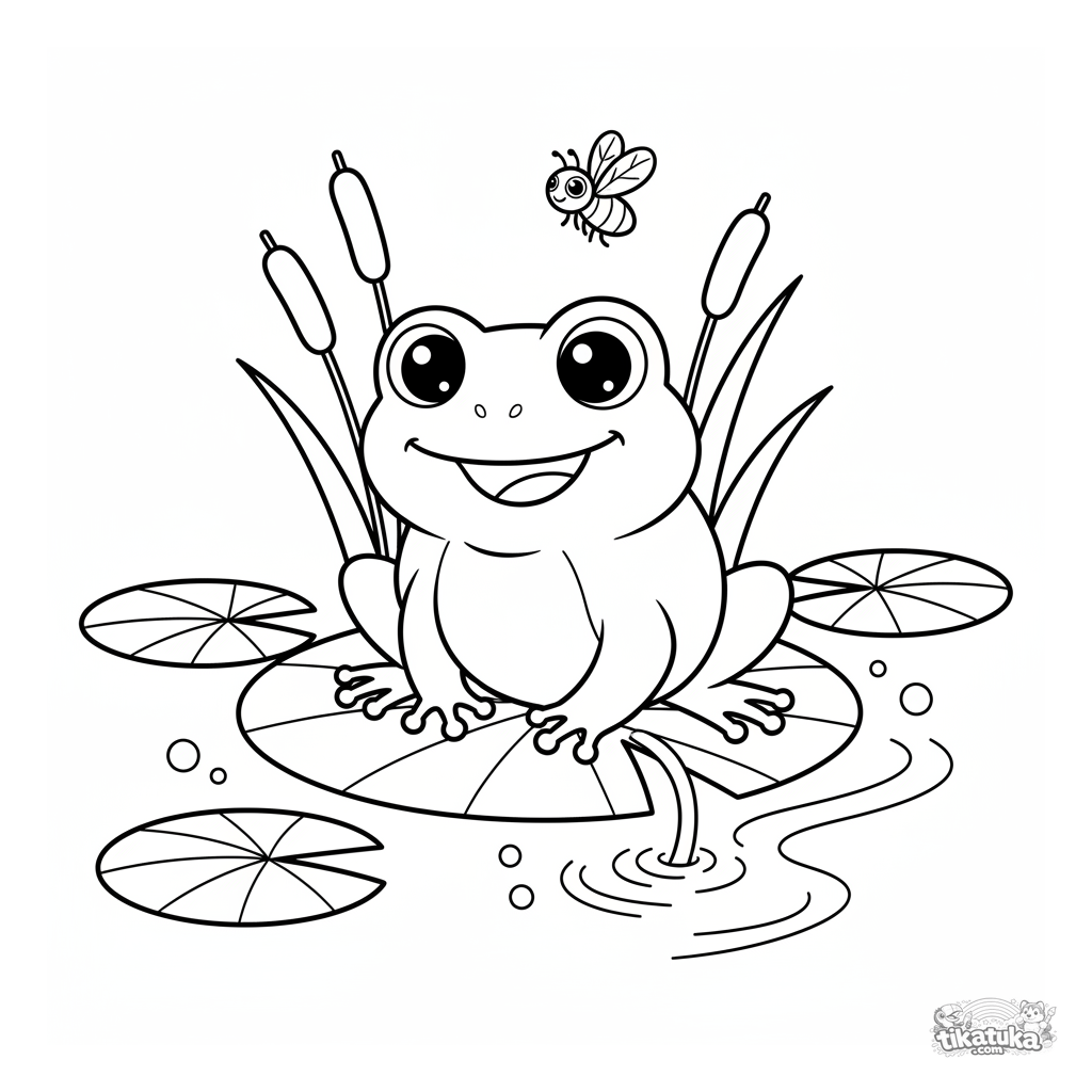 Sehr einfaches Ausmalbild für Kleinkinder 2-3: Ein glücklicher Frosch sitzt auf einem Seerosenblatt am Bach. Große geschlossene Formen, minimale Details, dicke Umrisse.