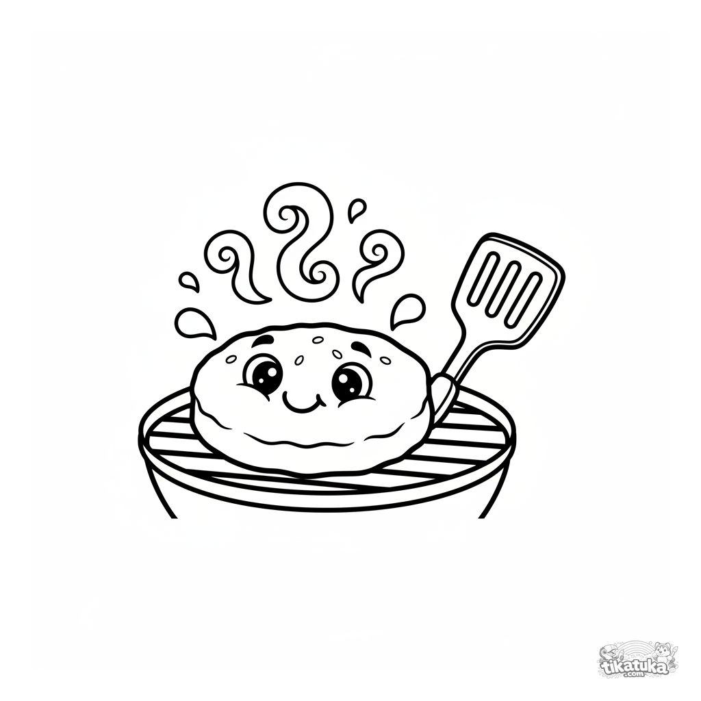 Einfaches Ausmalbild eines Hackfleischpattys auf einem Gartengrill. Für Kleinkinder von 2 bis 3 Jahren. Große Formen, wenige Details.
