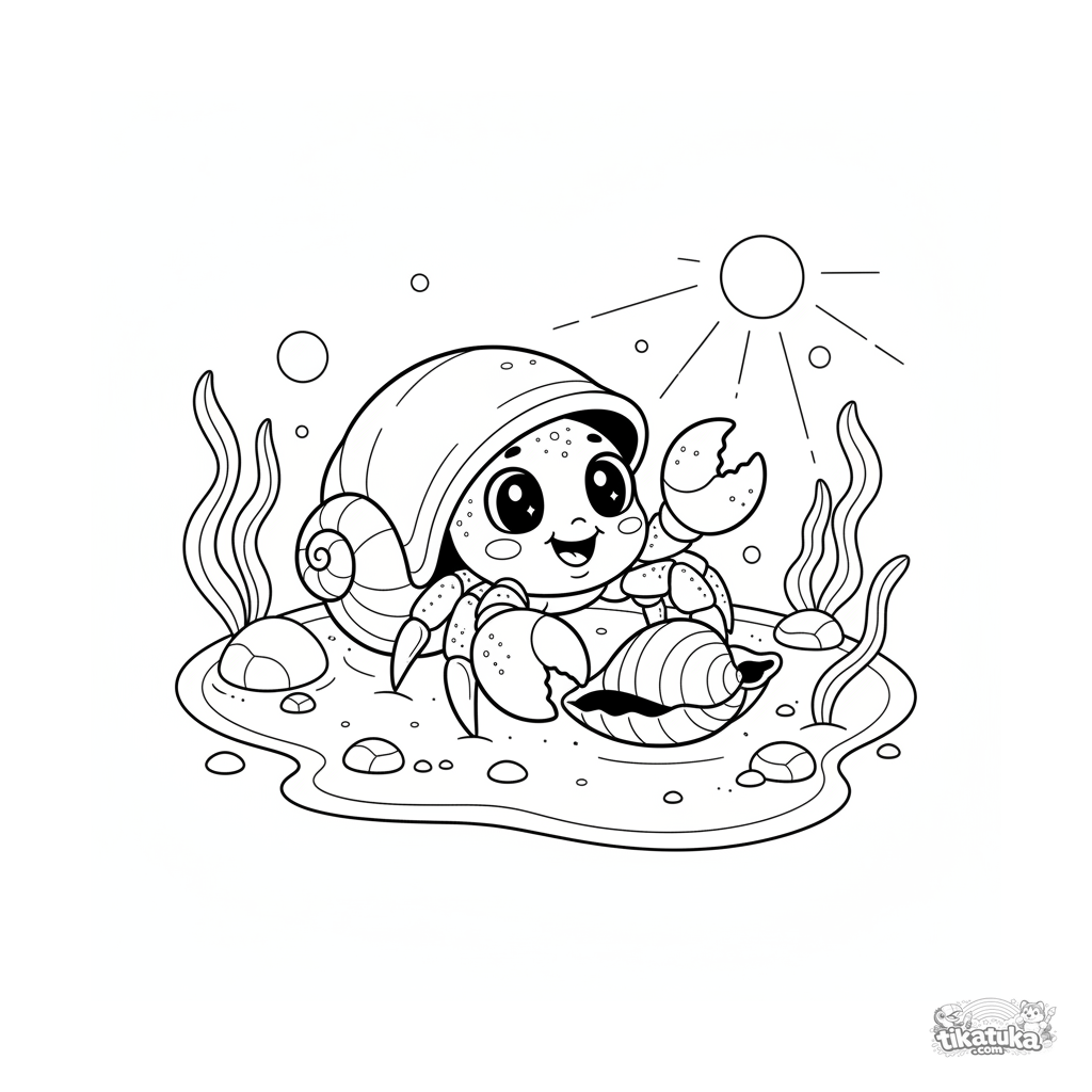 Ausmalbild für 4-6 Jahre: ein süßer Einsiedlerkrebs sucht ein neues Zuhause in einem sonnigen Gezeitenpool. Chibi-Stil.