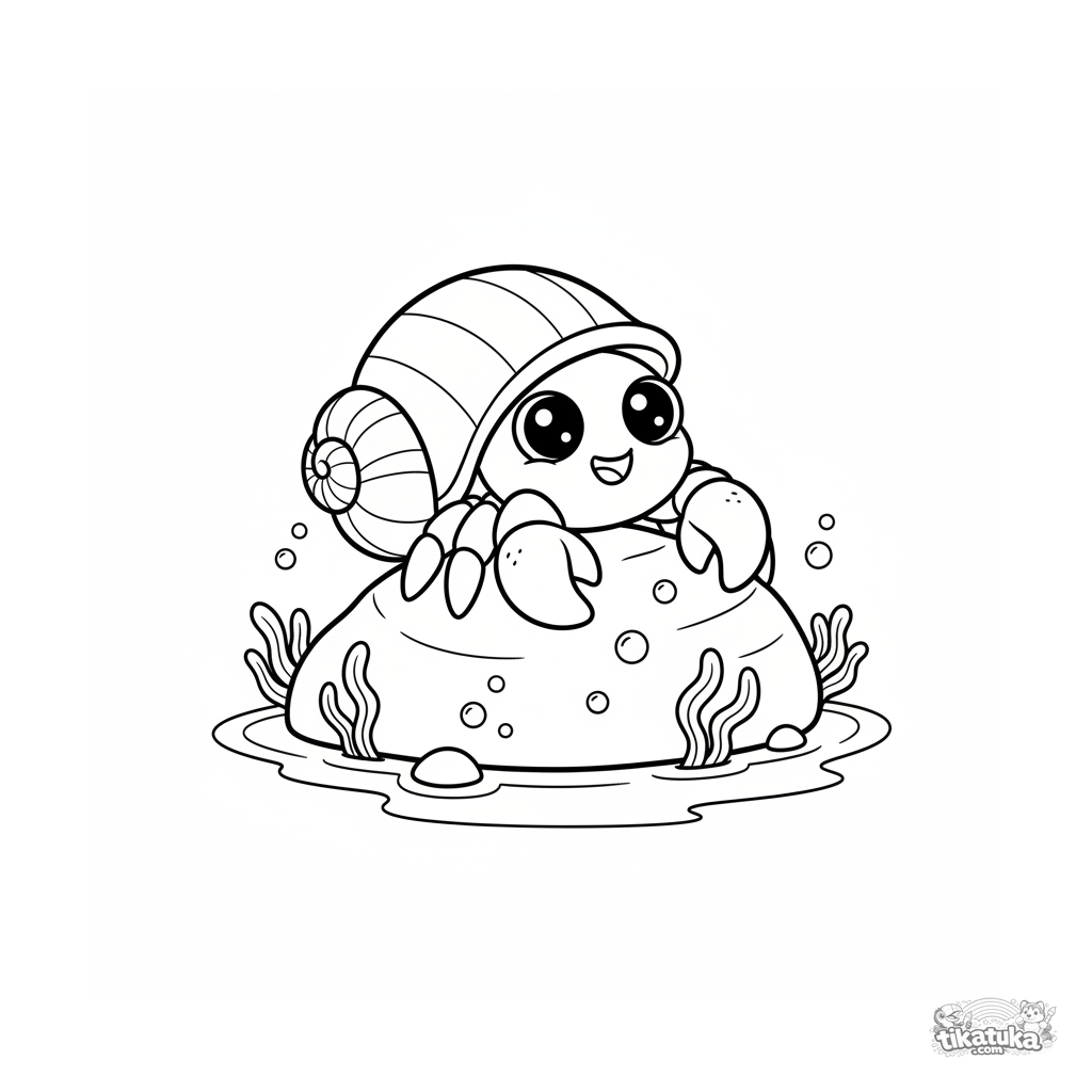 Ausmalbild eines süßen Einsiedlerkrebses, der einen sonnigen Gezeitentümpel erkundet. Für 4-6 Jahre, einfache und klare Formen.