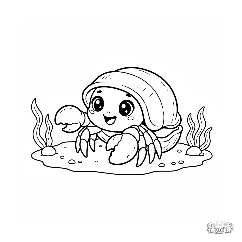 Ausmalbild eines süßen Einsiedlerkrebses, der im sonnigen Flachwasser sein Haus wechselt. Für 4-6 Jahre. Niedlicher Chibi-Stil, einfache Szene.