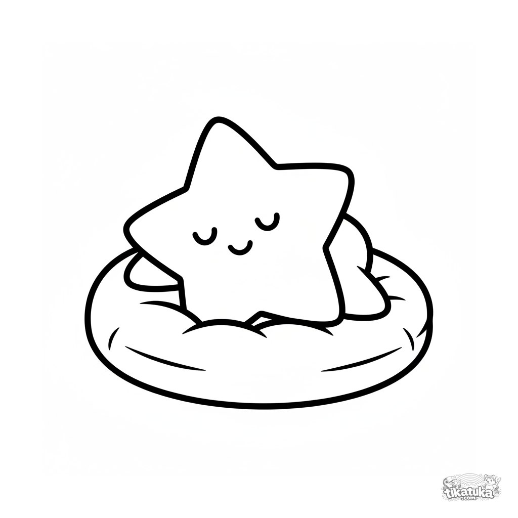 Einfaches geometrisches Ausmalbild für Kleinkinder: ein glücklicher Stern ruht auf einem Kissen. Minimale Details, große Flächen.