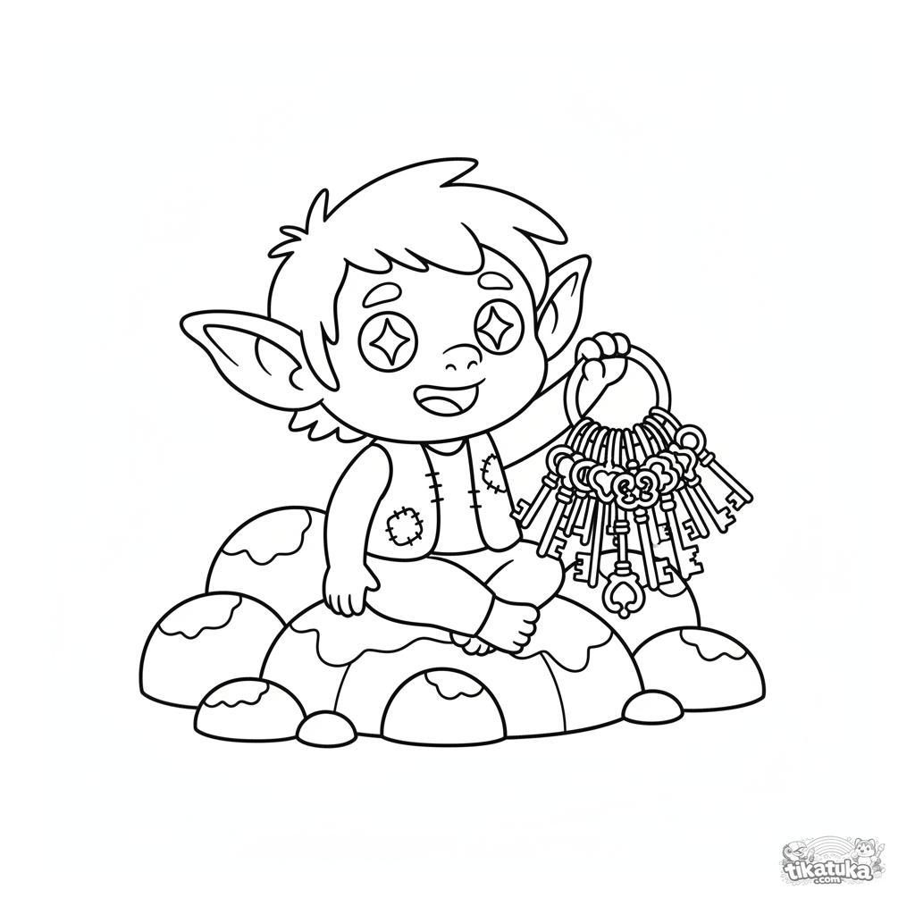 Kleinkind-Ausmalbild für 2-3 Jahre: ein fröhlicher Kobold mit großen Augen sitzt und bewundert seine Sammlung magischer Schlüssel. Sehr einfaches Bild mit dicken Umrisslinien.