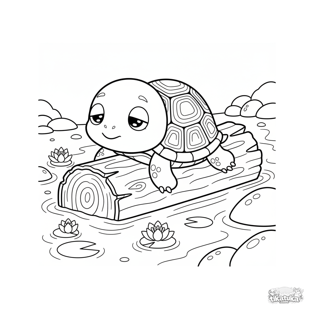 Ausmalbild für Kinder von 4-6 Jahren: eine freundliche Schildkröte mit rundem Panzer sonnt sich zufrieden auf einem halb versunkenen Baumstamm in einem Bach, mit halb geschlossenen Augen.