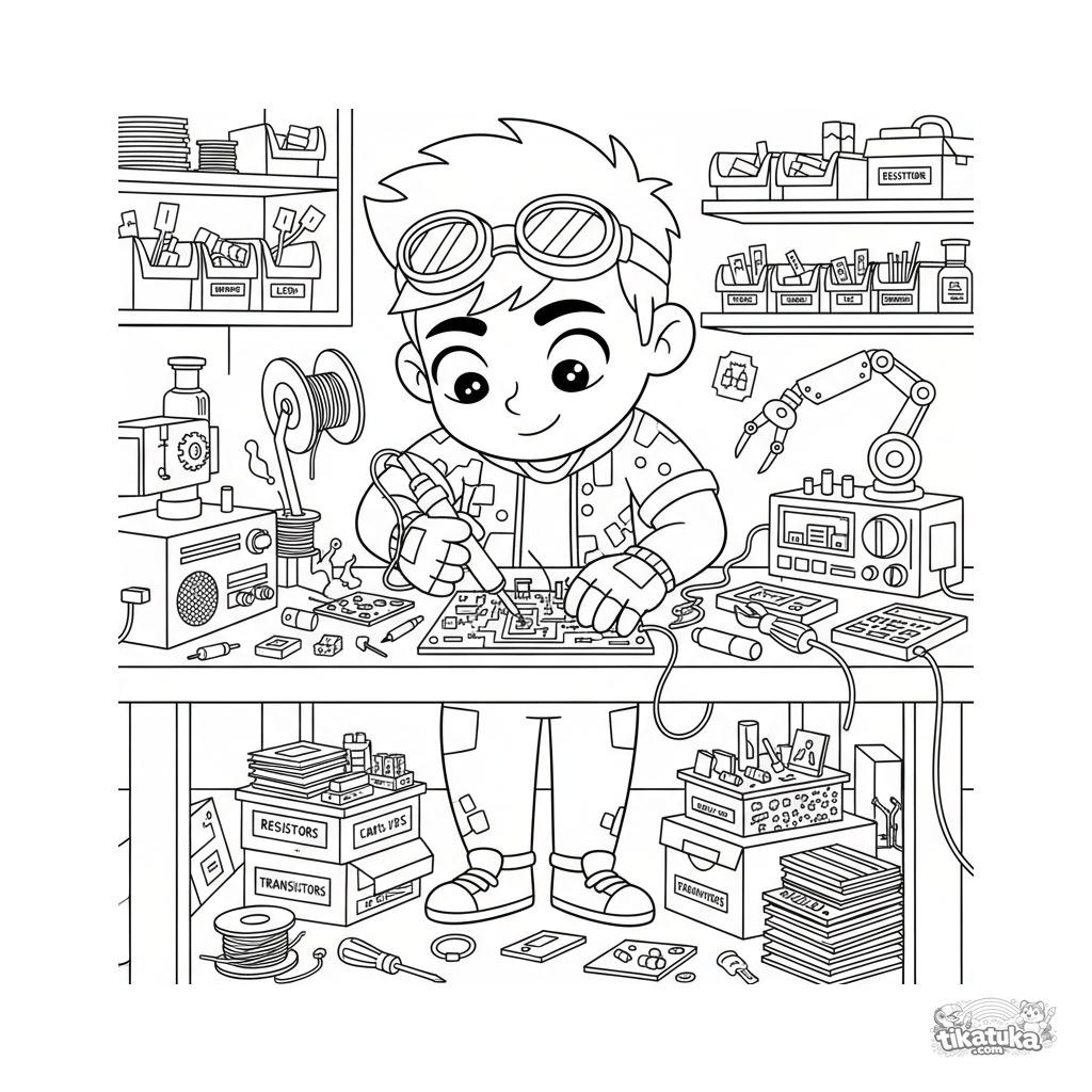 Detailliertes Ausmalbild für 10-12 Jahre: Ein Hardware-Modder lötet eine Platine in einer Kellerwerkstatt. Viele Werkzeuge, Teilebehälter, auseinandergebaute Geräte. Szene des Erschaffens.