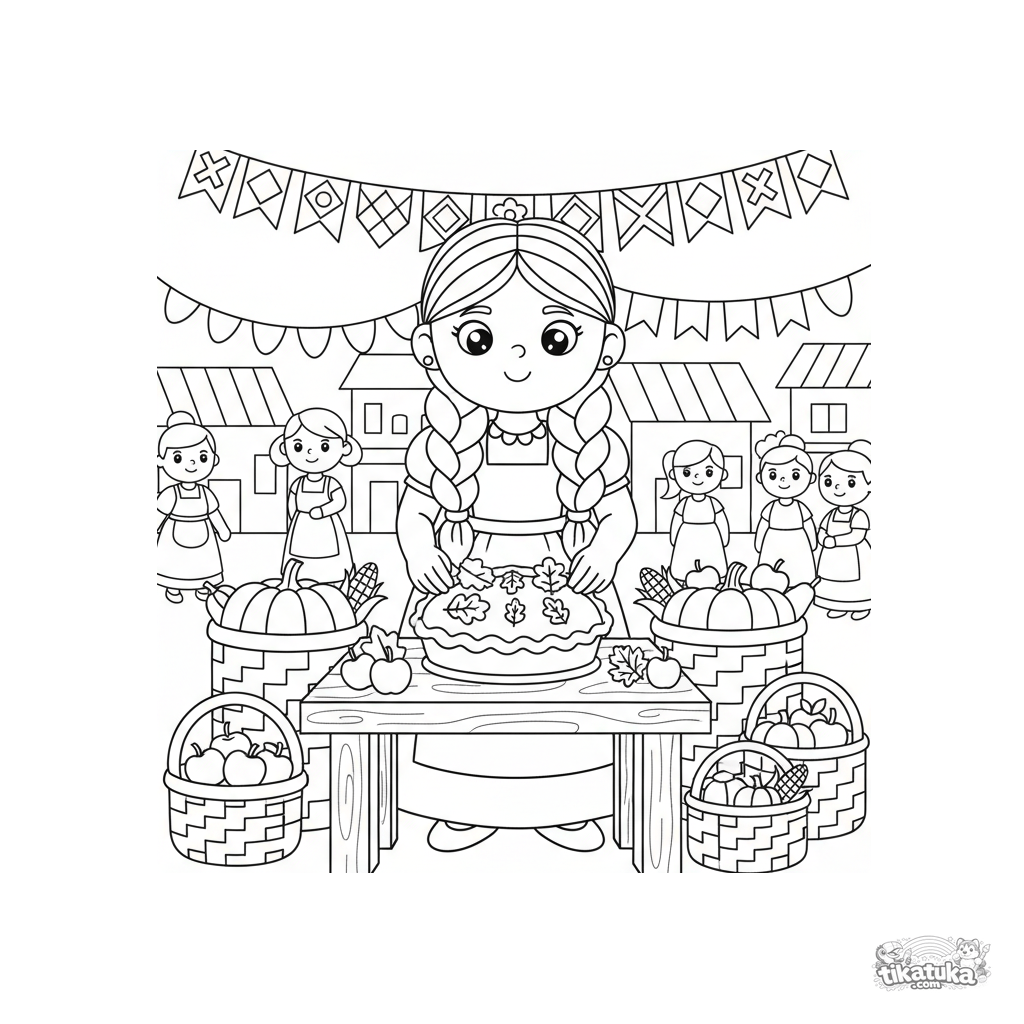 Ausmalbild für Kinder 4-6: Eine Ernteprinzessin in einer Schürze verziert einen Apfelkuchen auf einem Tisch auf dem Dorfplatz.