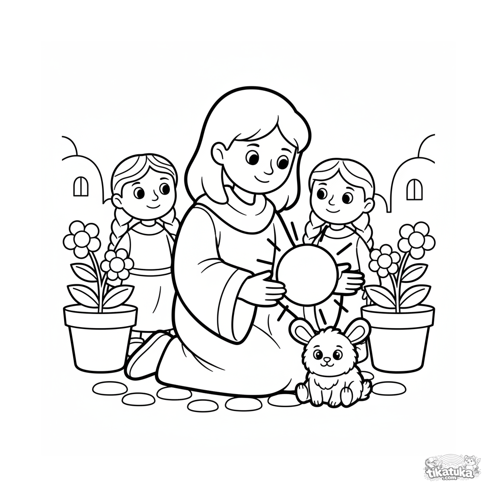 Ausmalbild für Kleinkinder 2-3: Ein freundlicher Heilerheld mit leuchtenden Händen hilft einem Tier auf einem Dorfplatz. Einfache Formen, große Details.