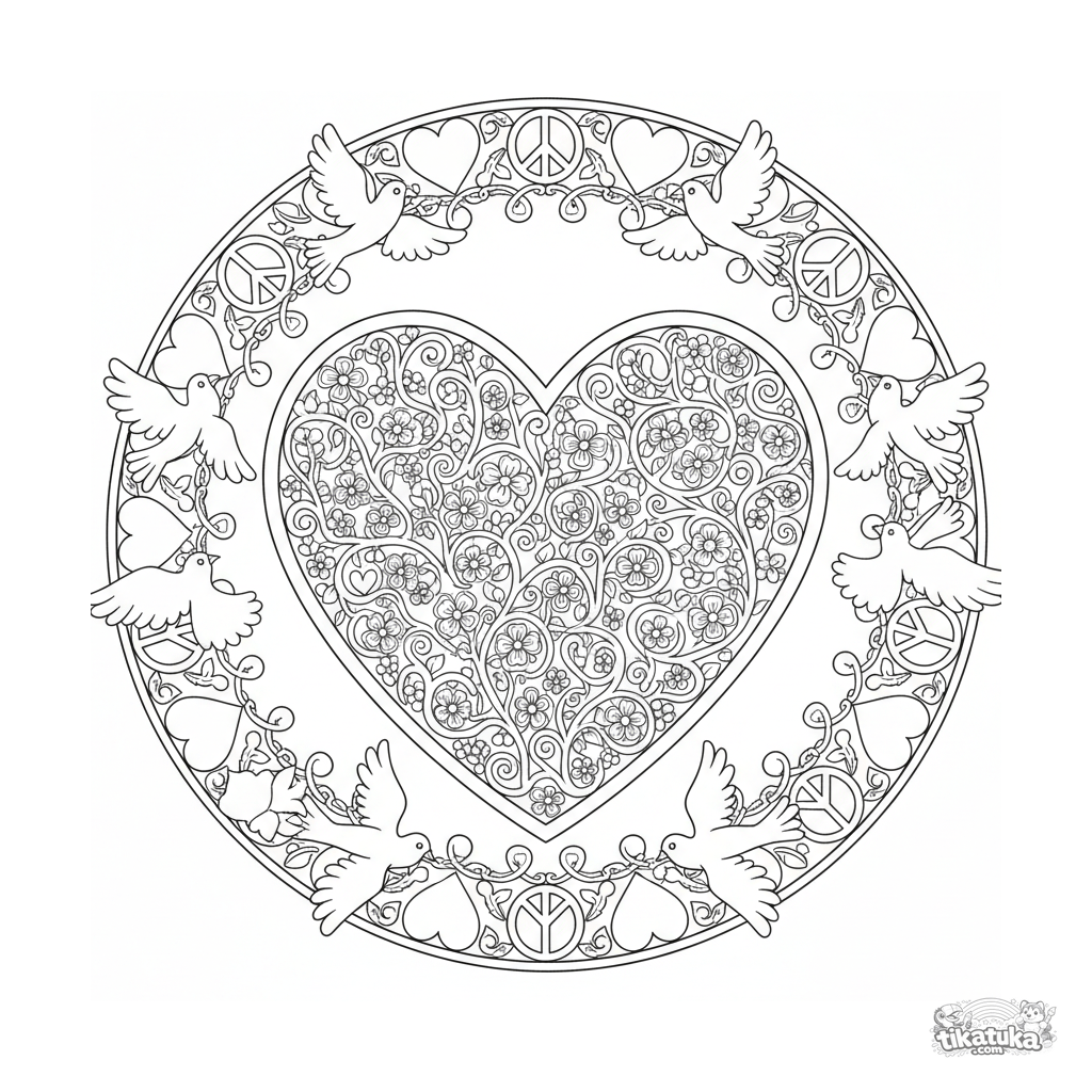 Elegante herzförmige Mandala, verziert mit Blumenranken und fliegenden Tauben. Ein detailliertes und positiv gestimmtes Ausmalbild für 10-12 Jährige.
