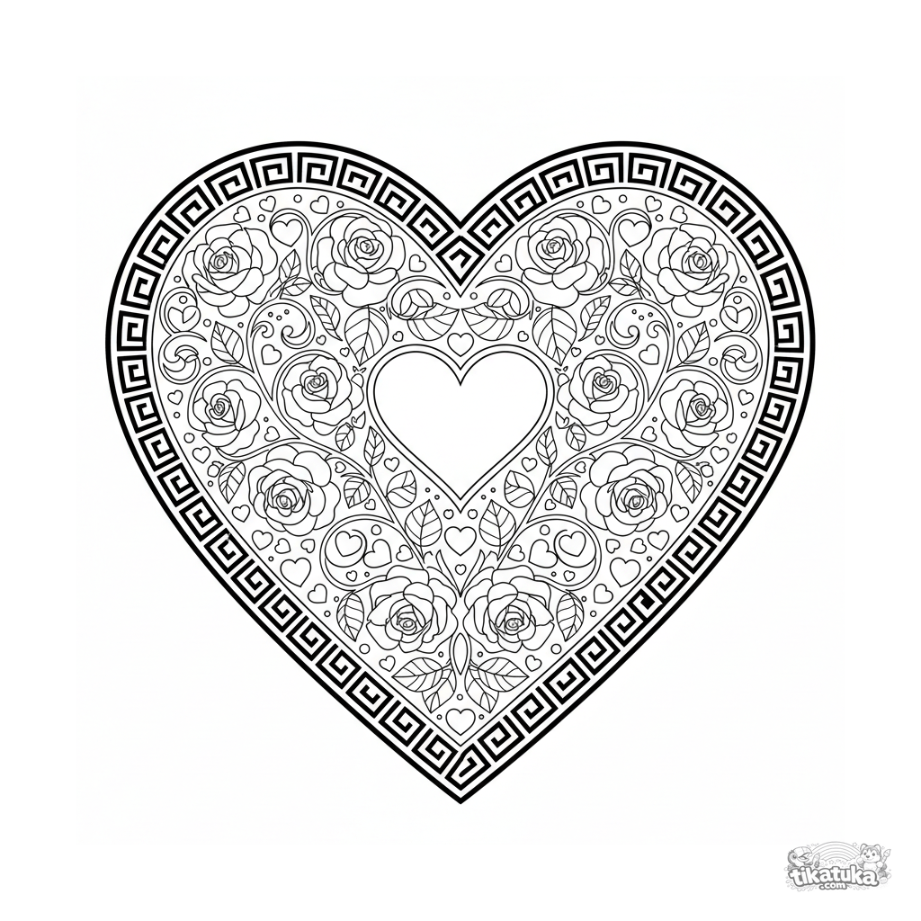 Detaillierte herzförmige Mandala-Ausmalbild für 10-12 Jahre. Zentrales Herz, wirbelnde Blumenranken und geometrischer griechischer Schlüsselmuster-Rand in perfekter Symmetrie.