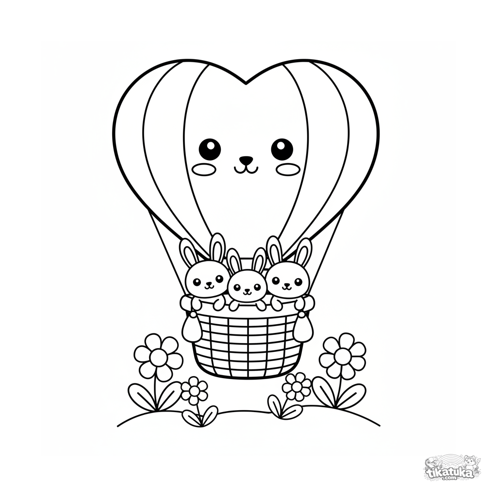 Einfaches und süßes Ausmalbild eines herzförmigen Heißluftballons auf einer Wiese. Für Kleinkinder von 2-3 Jahren. Riesige freie Flächen zum Ausmalen.