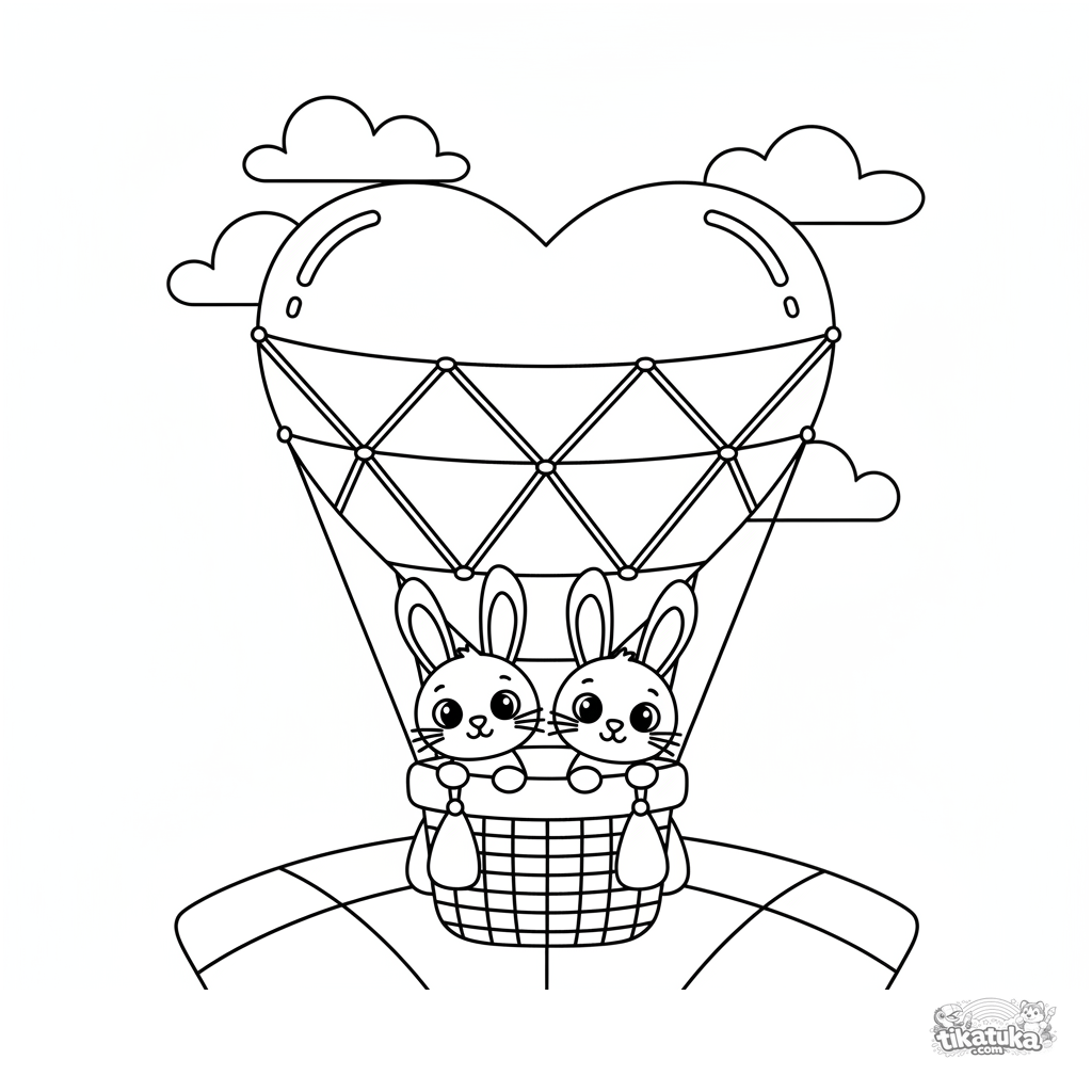 Kleinkind-Ausmalbild 2-3: Ein großer herzförmiger Heißluftballon schwebt über einer Wiese. Große, einfache Formen, dicke Umrisse.