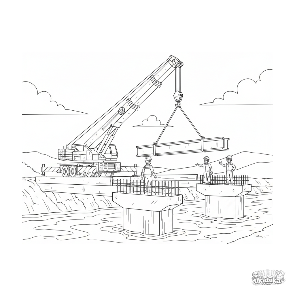 Detailliertes Ausmalbild für Jungen 10-12: Ein leistungsstarker Kranwagen beim Bau einer Brücke über einem Fluss. Technischer Blueprint-Stil.