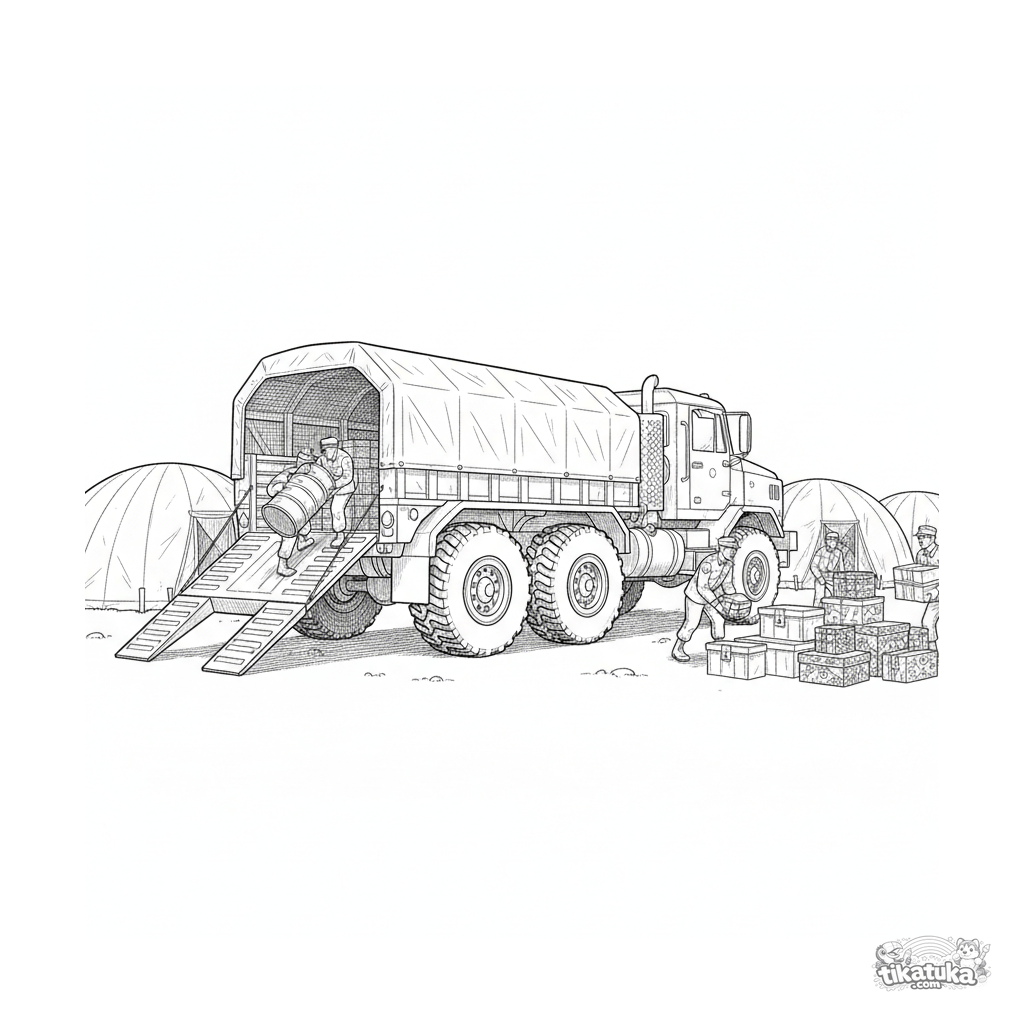 Detailliertes Ausmalbild eines schweren Armee-LKWs, der Vorräte an einem Feld-HQ entlädt. Für ältere Kinder von 10-12 Jahren.