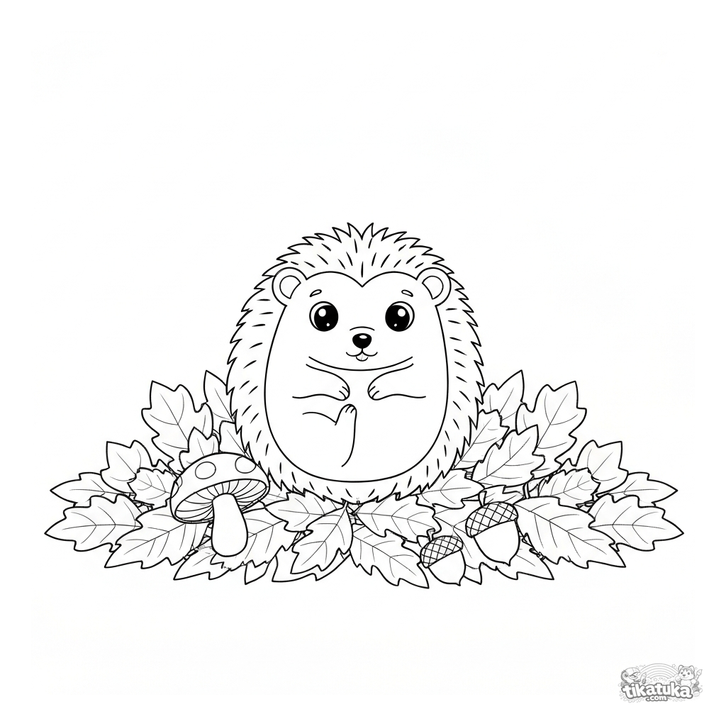 Herbst-Ausmalbild für Kleinkinder: Ein Igel schläft in einem Laubhaufen. Einfache Formen, gemütliche Szene, für 2-4 Jahre.
