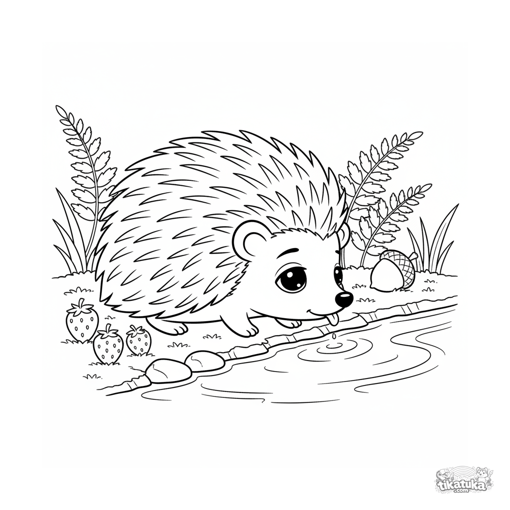 Ausmalbild für Kinder 4-6: ein niedlicher Igel kauert am Rand eines klaren Baches zum Trinken, mit wilden Beeren in der Nähe.