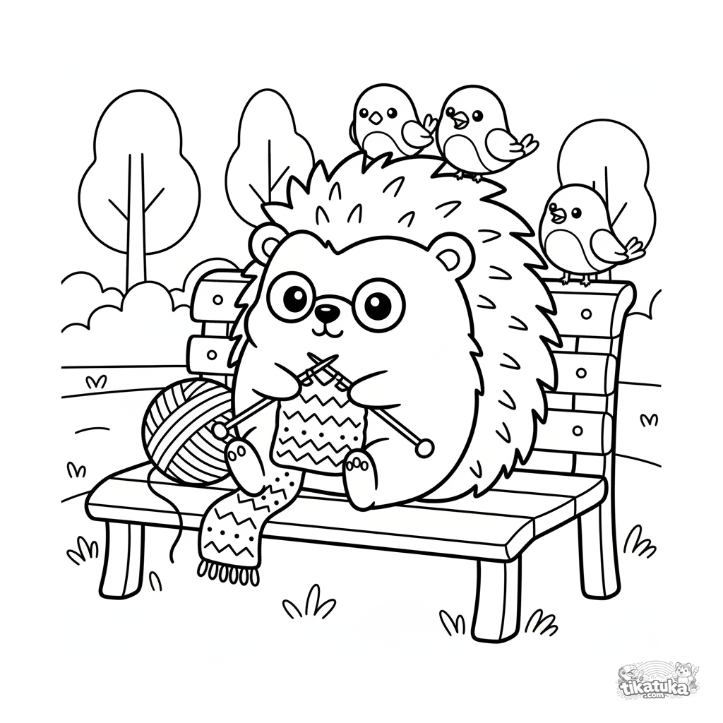 Ausmalbild für Kinder 4-6: Ein niedlicher Igel strickt einen Schal auf einer Parkbank. Kawaii-Stil, einfache Komposition.