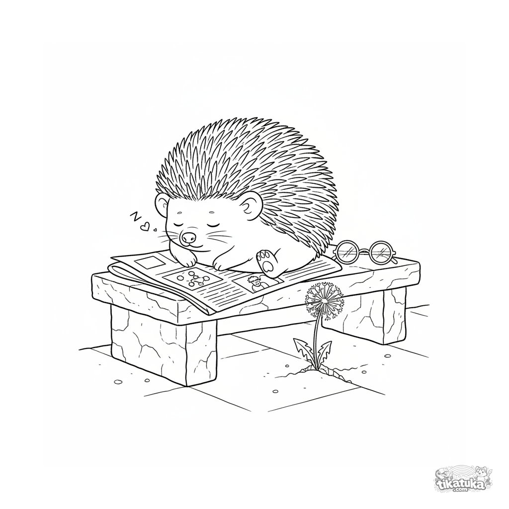 Detailliertes Ausmalbild für 10-12 Jahre: Ein realistischer Igel schläft auf einer Zeitung auf einer Parkbank. Mit Brille und Löwenzahn, eine gemütliche Stadtszene.