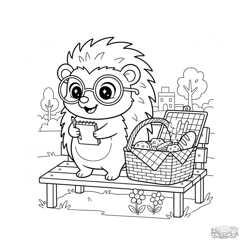 Ausmalbild für Kinder 7-9: Ein fröhlicher Igel mit Brille bereitet ein Picknick auf einer Parkbank vor. Helle und detaillierte Szene.