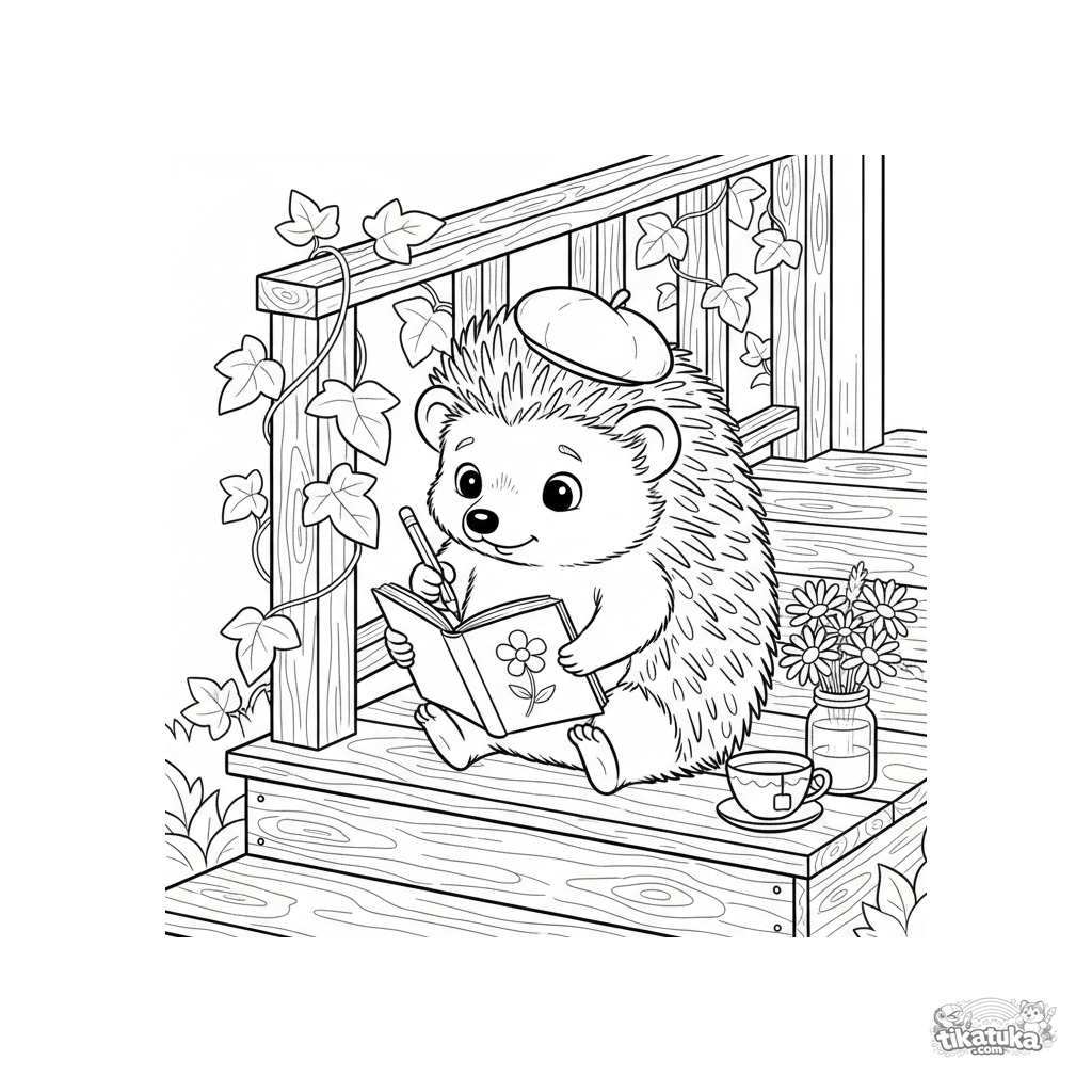 Ausmalbild für Kinder 7-9: Ein künstlerischer Igel zeichnet in einem Skizzenbuch auf den Stufen einer Sommerveranda. Moderate Details.