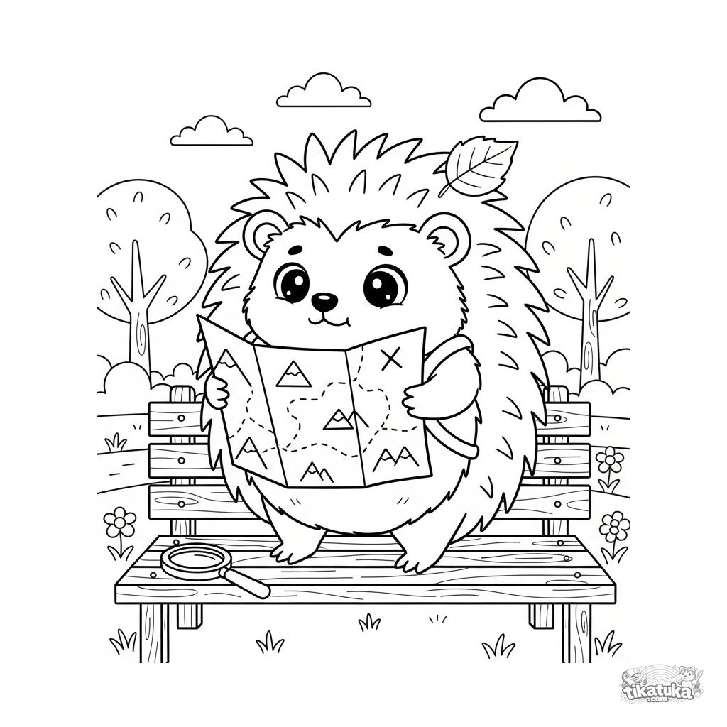 Ausmalbild für 7-9 Jahre: Ein abenteuerlustiger Igel mit Rucksack studiert eine Karte auf einer Bank. Lustige und dynamische Szene.