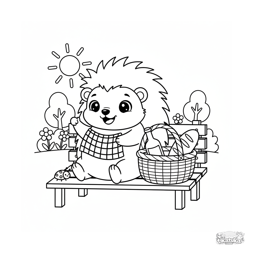 Ausmalbild für Kinder 4-6: Ein niedlicher Chibi-Igel bereitet ein Picknick auf einer Stadtparkbank vor und packt Dinge aus einem Weidenkorb.