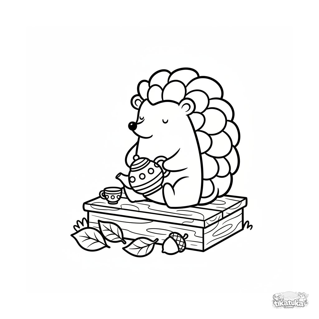 Einfaches Kleinkind-Ausmalbild: Ein Igel gießt Tee auf einer Verandastufe. Große, geschlossene Formen, sehr wenige innere Linien.