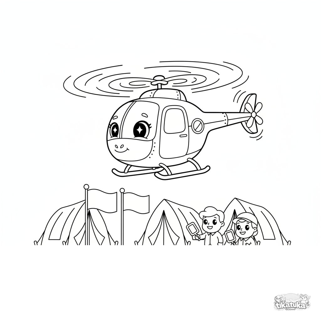 Ausmalbild für Kinder 4-6: Ein Hubschrauber landet nahe einem Feldhauptquartier. Szene mit Crew, Flaggen und Zelten, dynamische Linien.