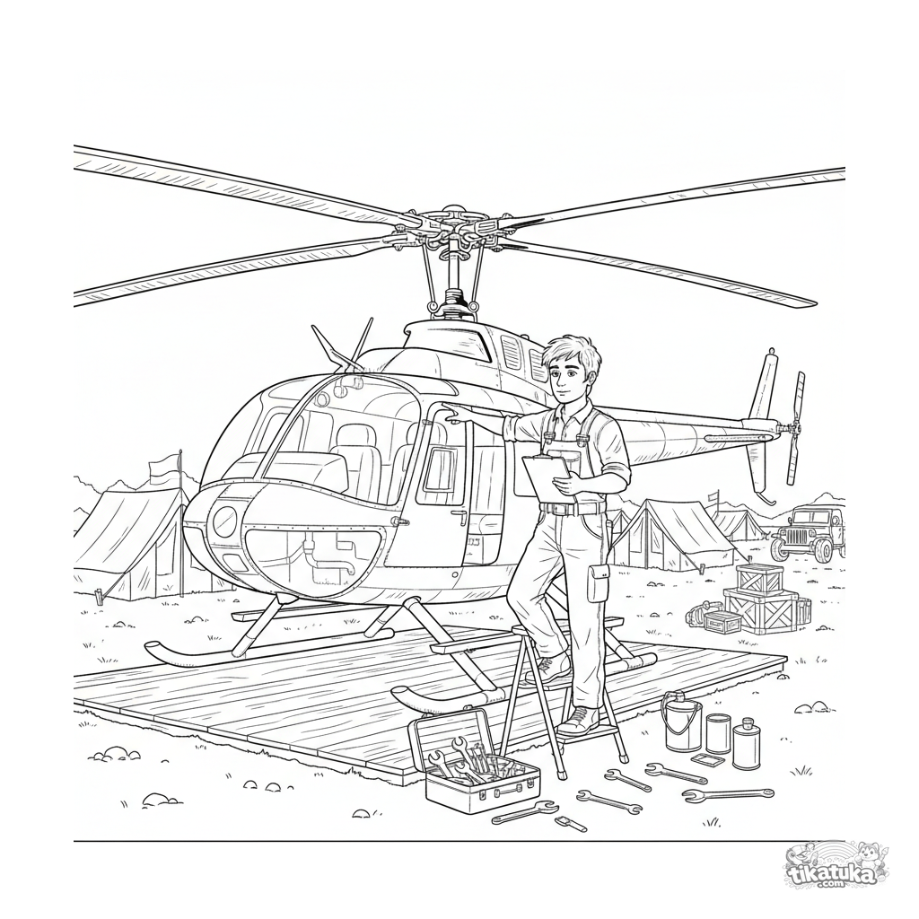 Detailliertes Ausmalbild für 10-12 Jahre: Ein Mechaniker prüft den Rotor eines Helikopters in der Nähe eines Feldhauptquartiers.