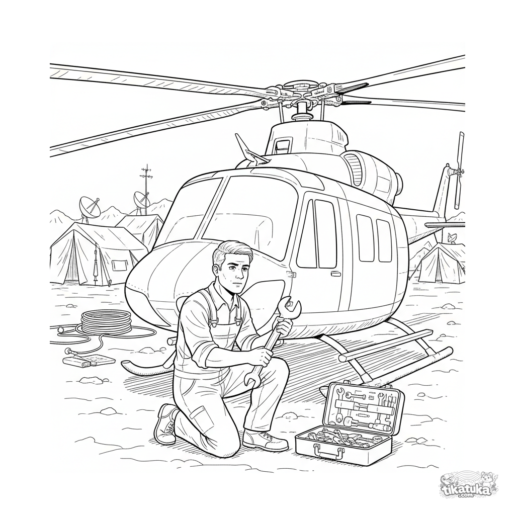 Detailliertes Ausmalbild für 10-12 Jahre: Ein Mechaniker prüft einen Helikopterrotor in der Nähe eines Feldhauptquartiers mit Zelten.