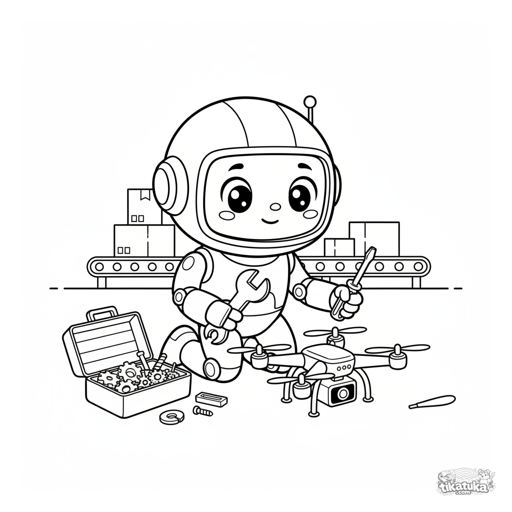 Ausmalbild für Kinder 7-9: Ein lustiger Helfer-Roboter im 90er-Stil repariert eine kaputte Drohne auf dem Lagerhausboden. Ausdrucksstarke Formen, dynamische Szene, mäßiges Detail.