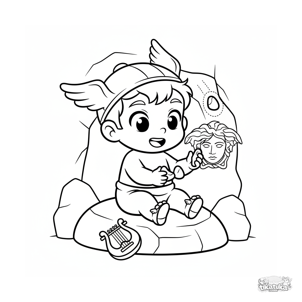 Einfaches Ausmalbild im Anime-Stil für Kleinkinder 2-3: Baby Hermes mit Flügelsandalen spielt fröhlich Hüpfkästchen auf dem Höhlenboden.