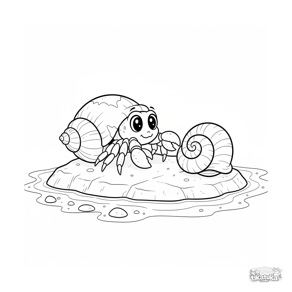 Ausmalbild eines Einsiedlerkrebses, der in ein neues Gehäuse in einem sonnenbeschienenen Gezeitentümpel umzieht. Für Kinder von 7 bis 9 Jahren.