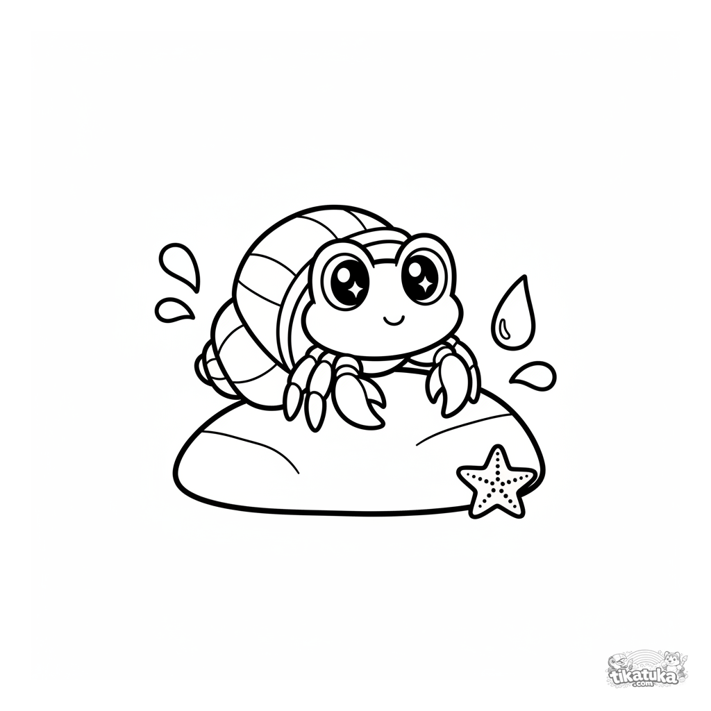 Einfaches Ausmalbild für Kleinkinder: ein Einsiedlerkrebs, der aus seiner Muschel auf einem sonnigen Felsen im flachen Gezeitentümpel lugt. Große Formen, wenige Details. Für 2-3 Jahre.