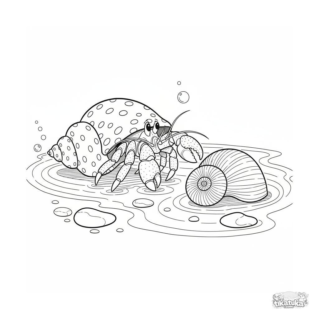 Detailliertes Ausmalbild für 10-12 Jahre: ein Einsiedlerkrebs wechselt sein Haus in einem sonnigen Gezeitenpool. Lehrreiche Szene mit anatomischen Details.