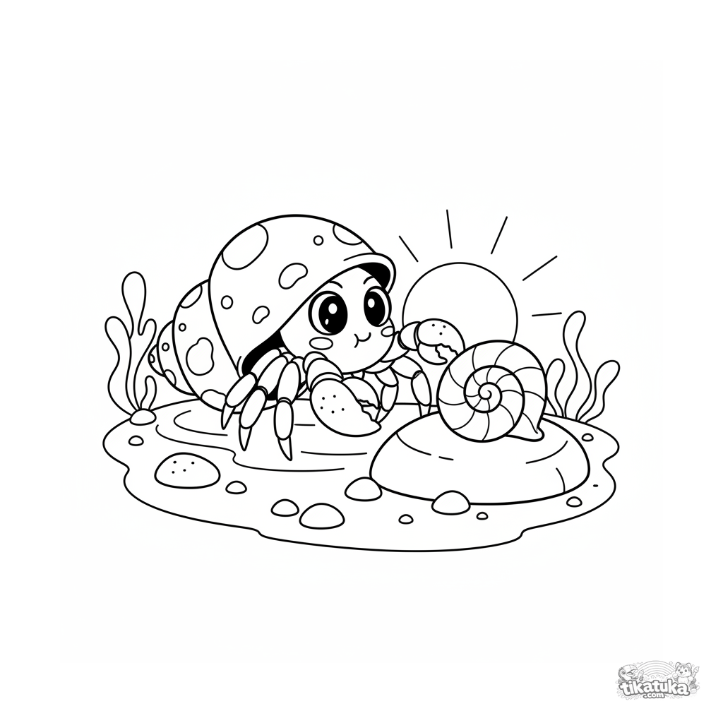 Ausmalbild eines Einsiedlerkrebses, der im sonnigen Gezeitentümpel sein Haus wechselt. Detaillierte Szene für Kinder von 7-9 Jahren.