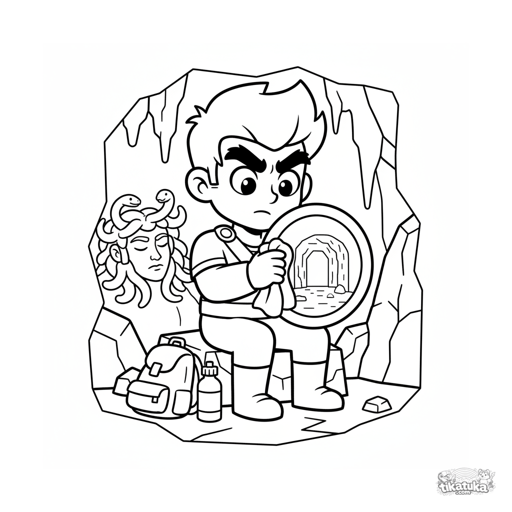 Ausmalbild: Ein Held bereitet sich in der Gorgonenhöhle vor. Für Kinder von 7-9 Jahren. Figur poliert einen Schild, um ihn als Spiegel zu benutzen.