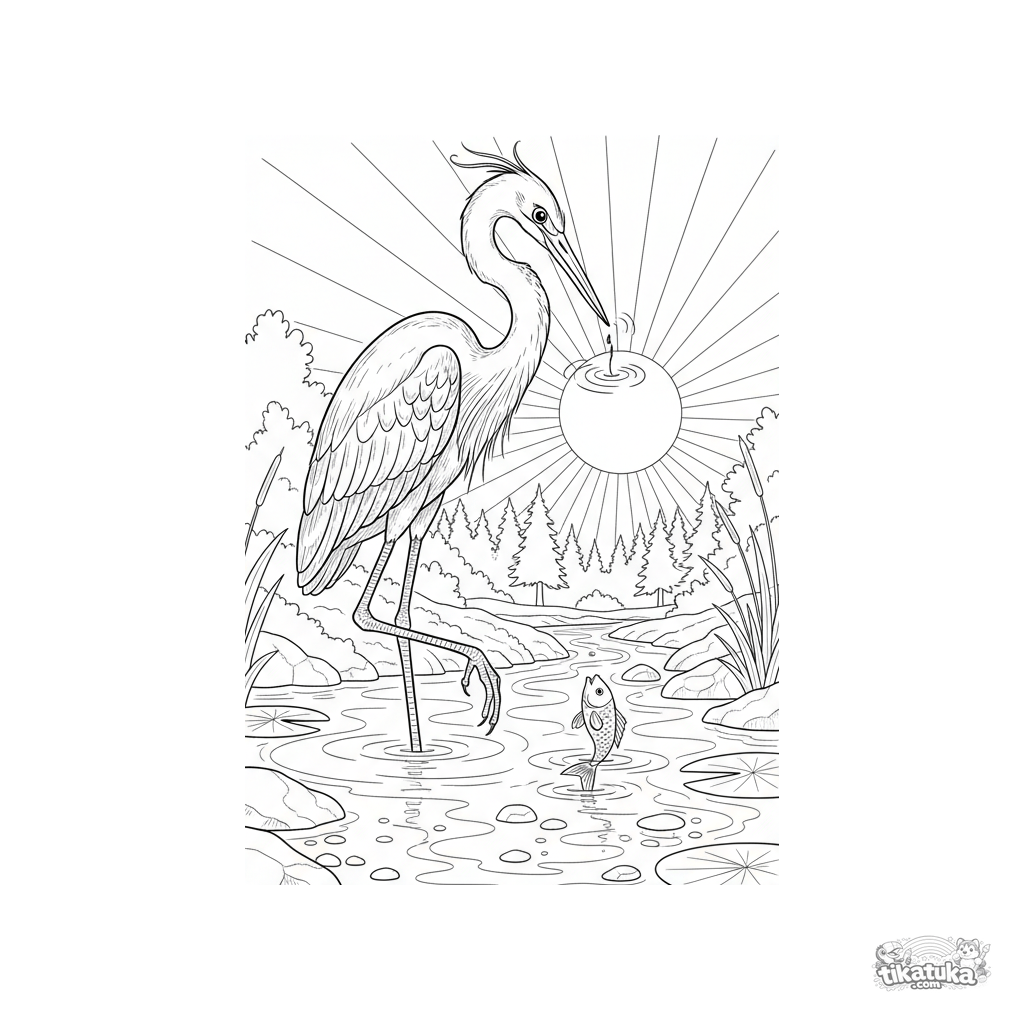 Detailliertes Ausmalbild für ältere Kinder 10-12: Ein Reiher steht bereit zum Fischen in einem klaren Bach bei Sonnenuntergang. Komplexe Naturlandschaftsszene zum kreativen Ausmalen.